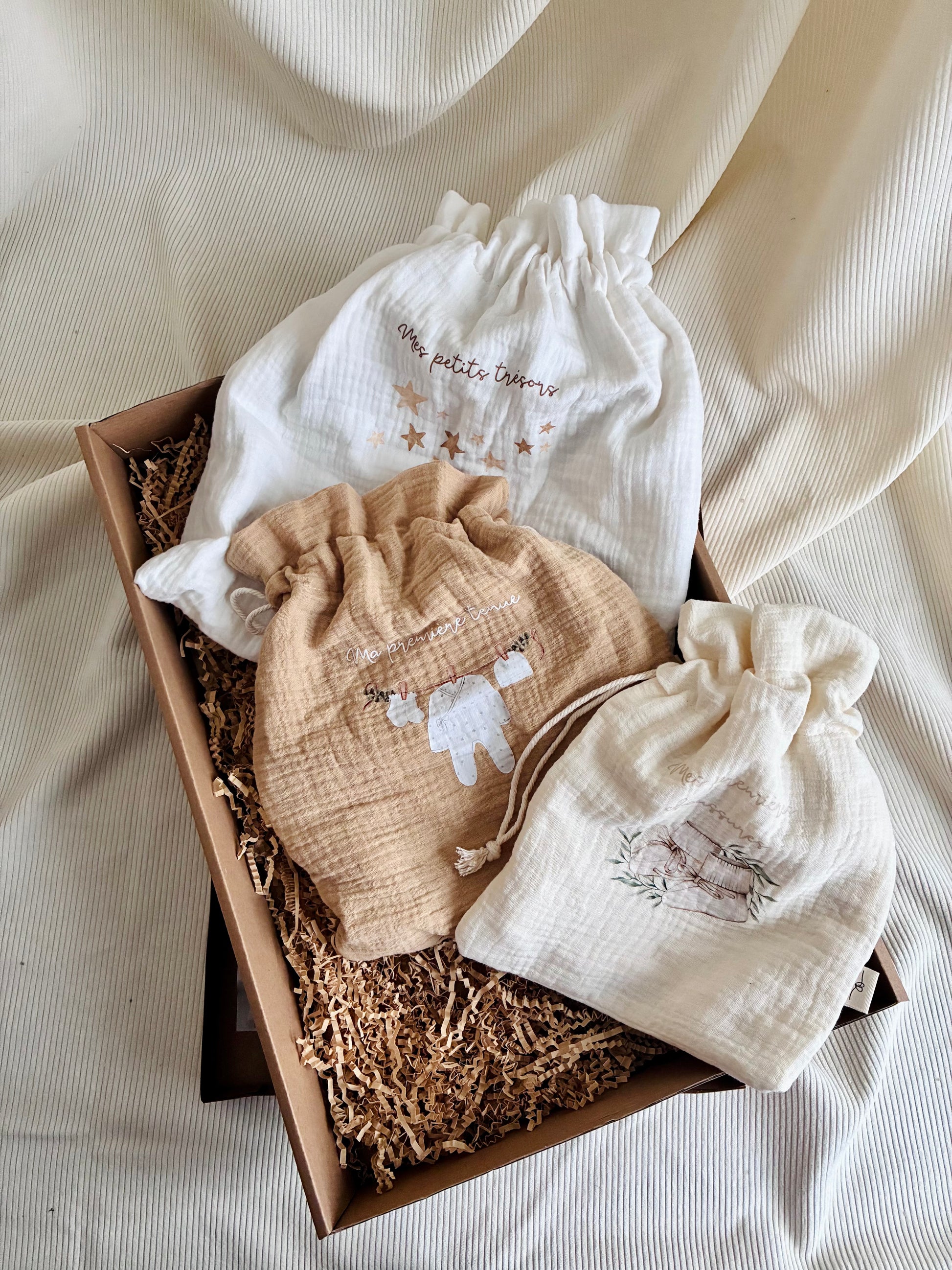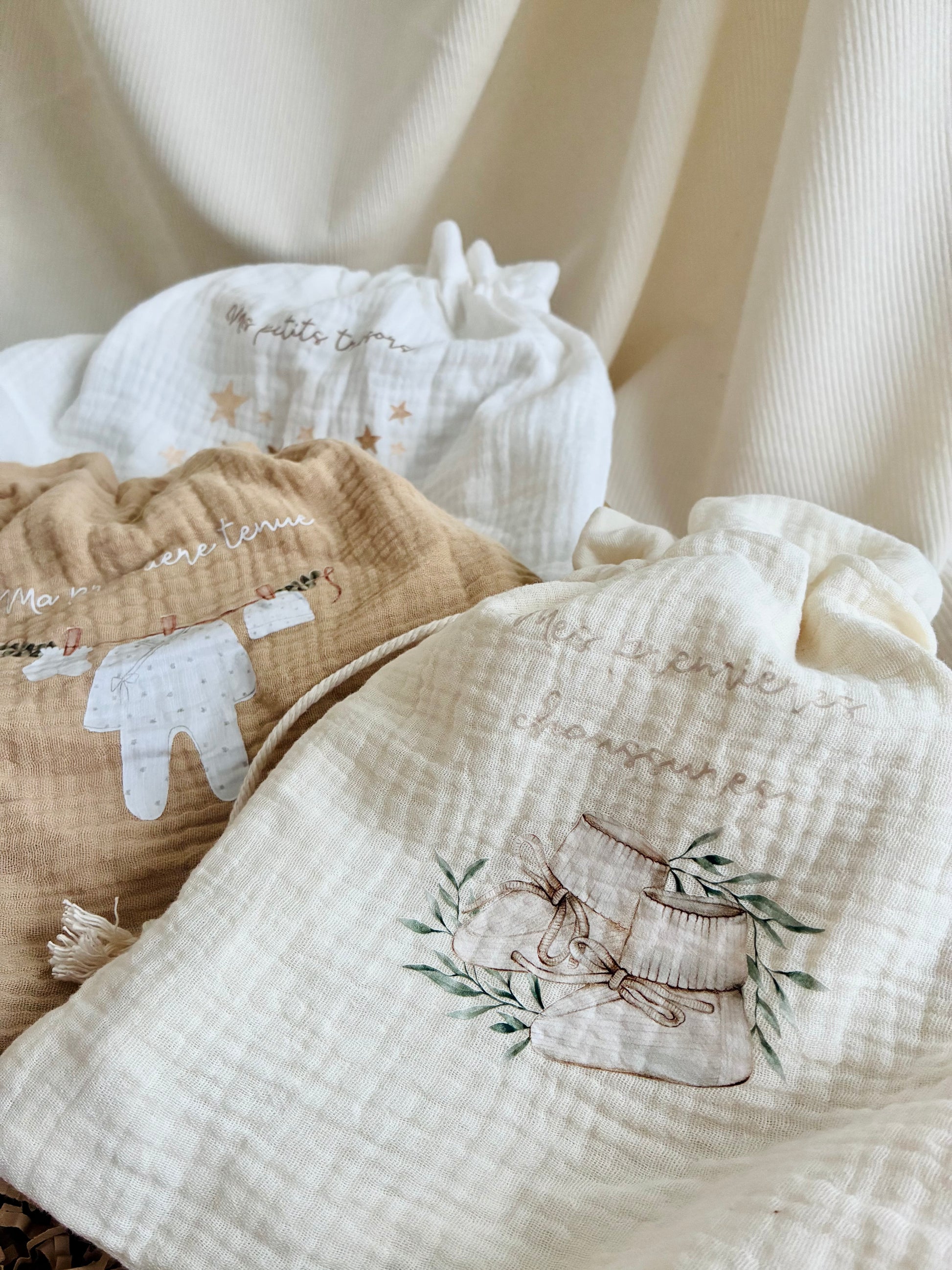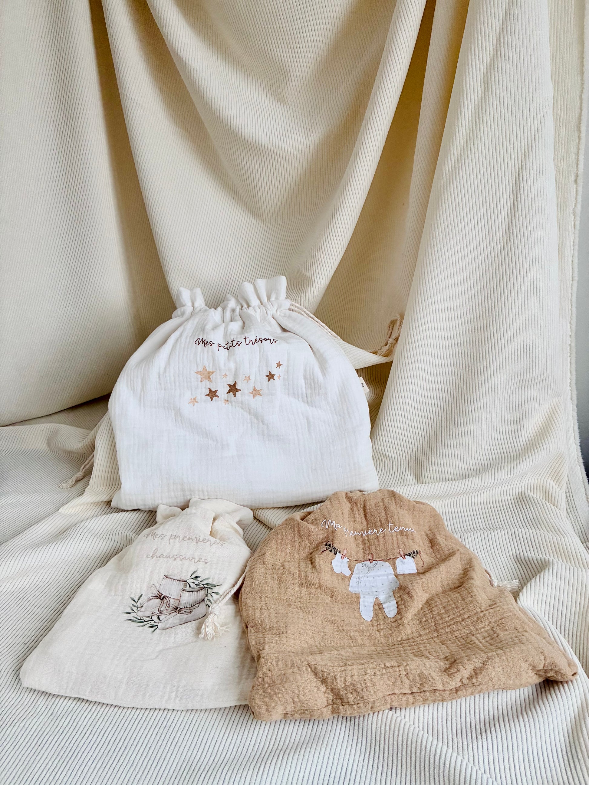 Ensemble cadeau pour pour ranger les premiers souvenirs de bébé. Comprend trois pochons en coton gaze dans des teintes neutres, munis d'un cordon en coton naturel pour la fermeture. Parfait pour un cadeau de naissance. Possibilité d'ajouter le prénom sur un ou plusieurs pochons (voir Personnalisation dans la boutique).