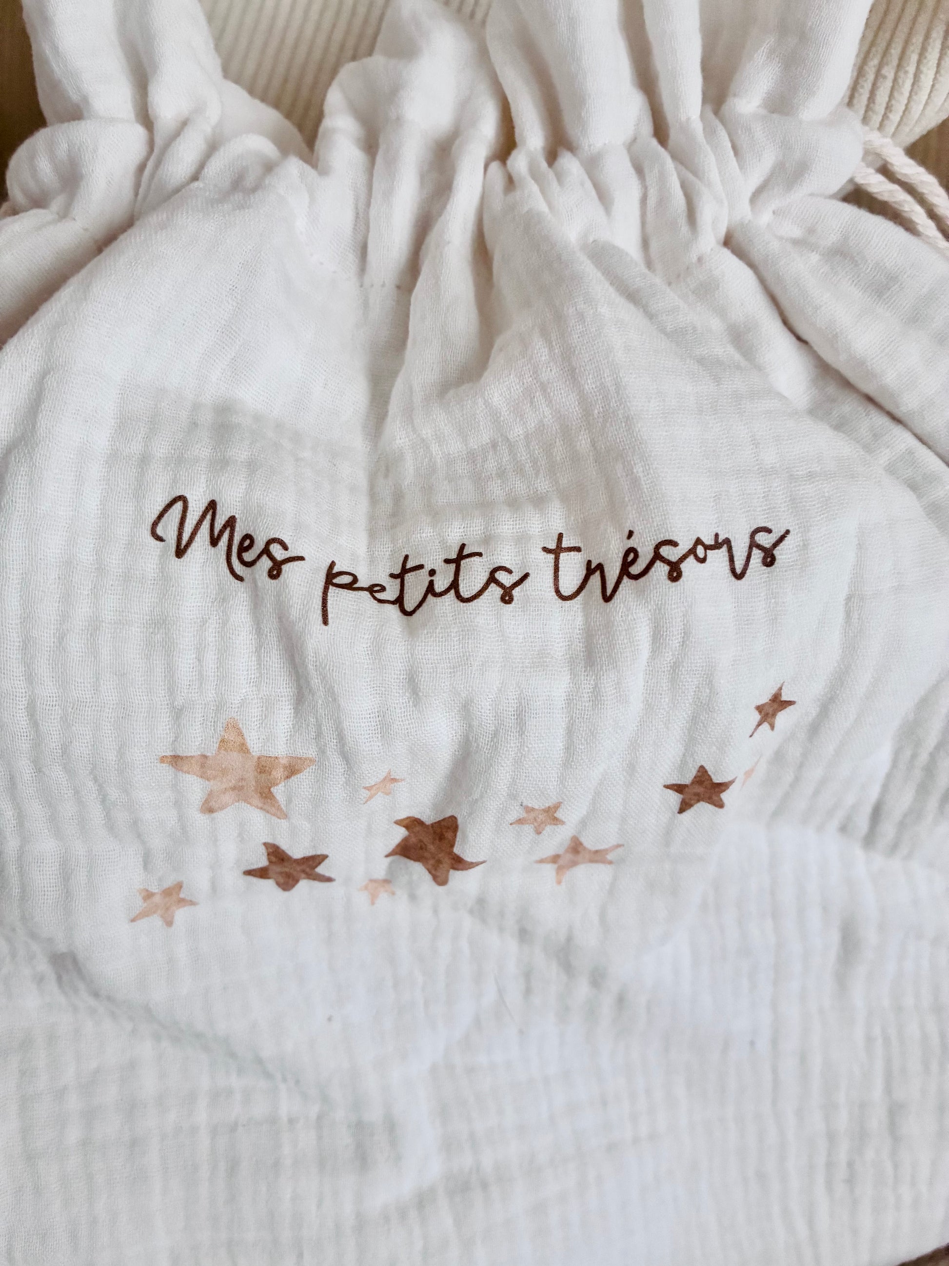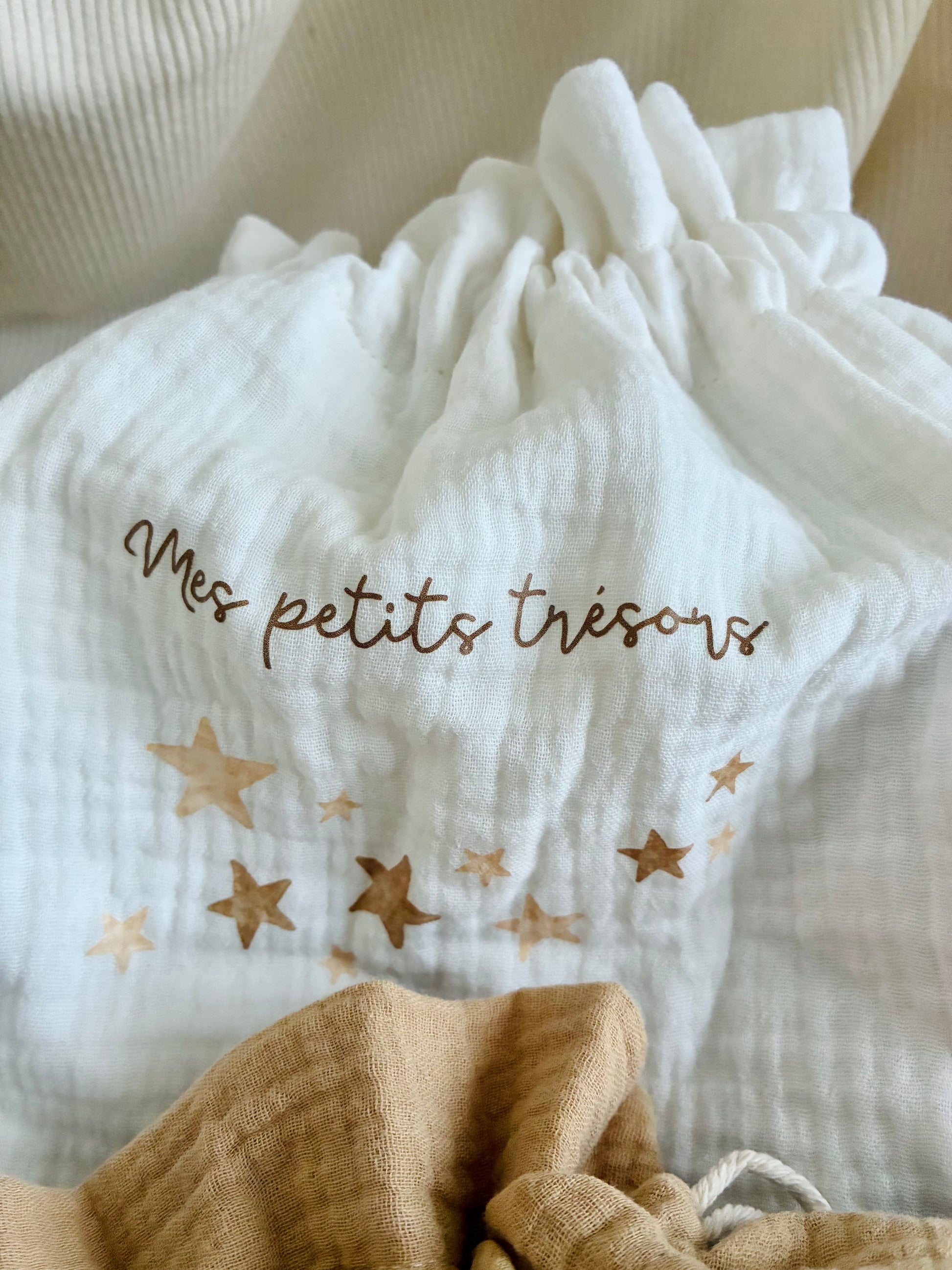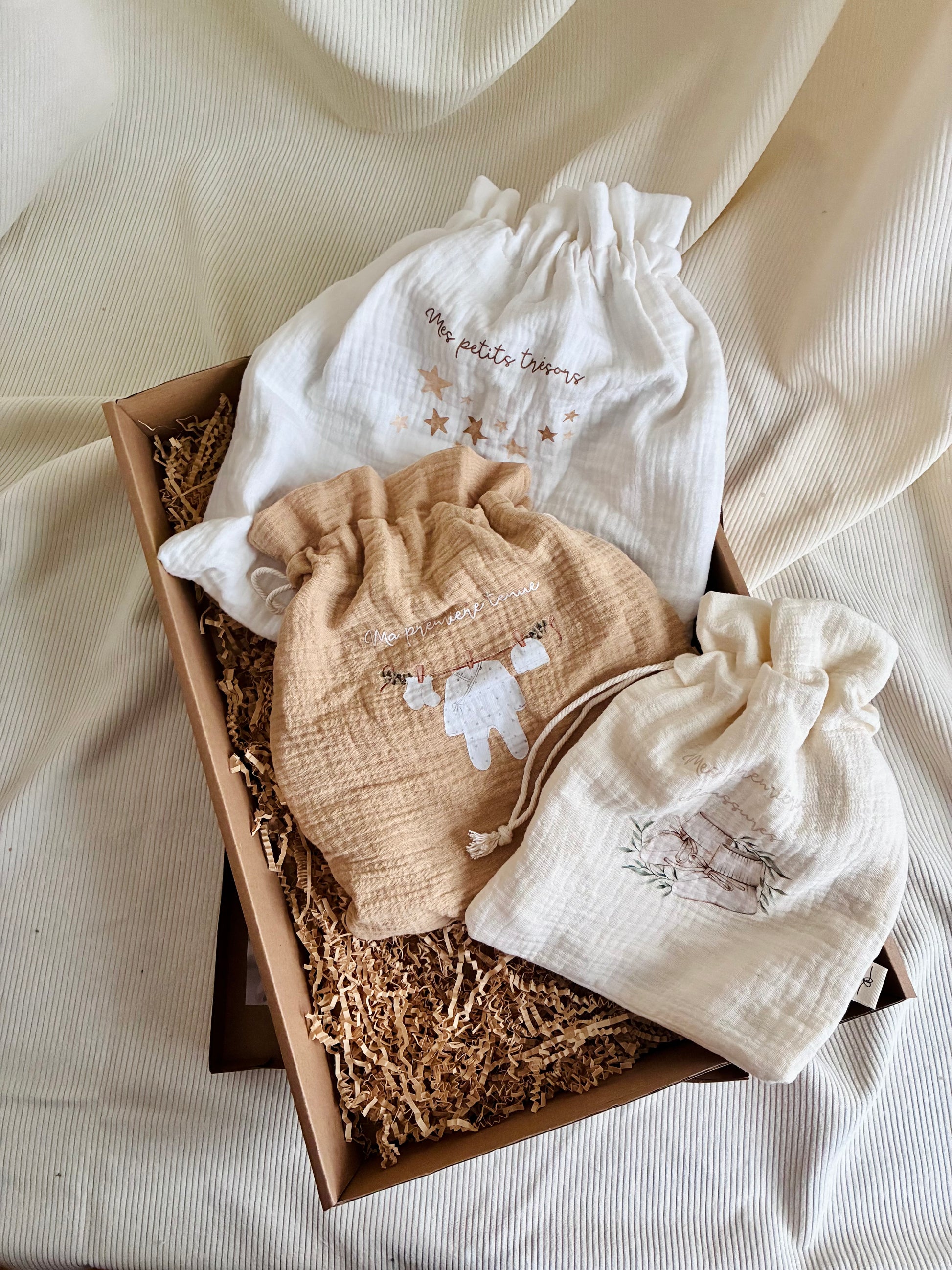Ensemble cadeau pour pour ranger les premiers souvenirs de bébé. Comprend trois pochons en coton gaze dans des teintes neutres, munis d'un cordon en coton naturel pour la fermeture. Parfait pour un cadeau de naissance. Possibilité d'ajouter le prénom sur un ou plusieurs pochons (voir Personnalisation dans la boutique).