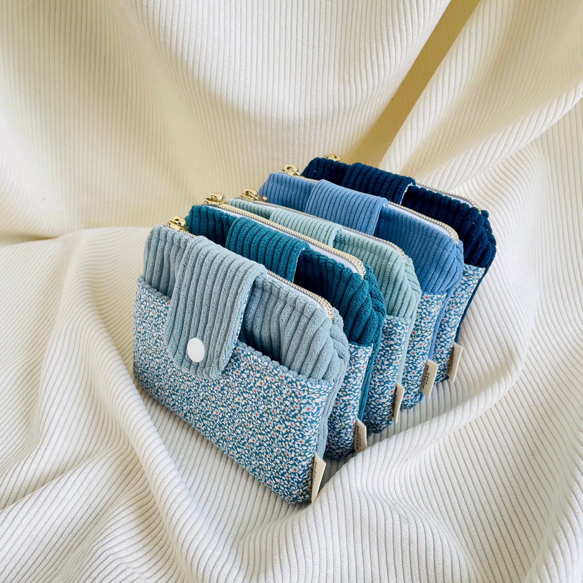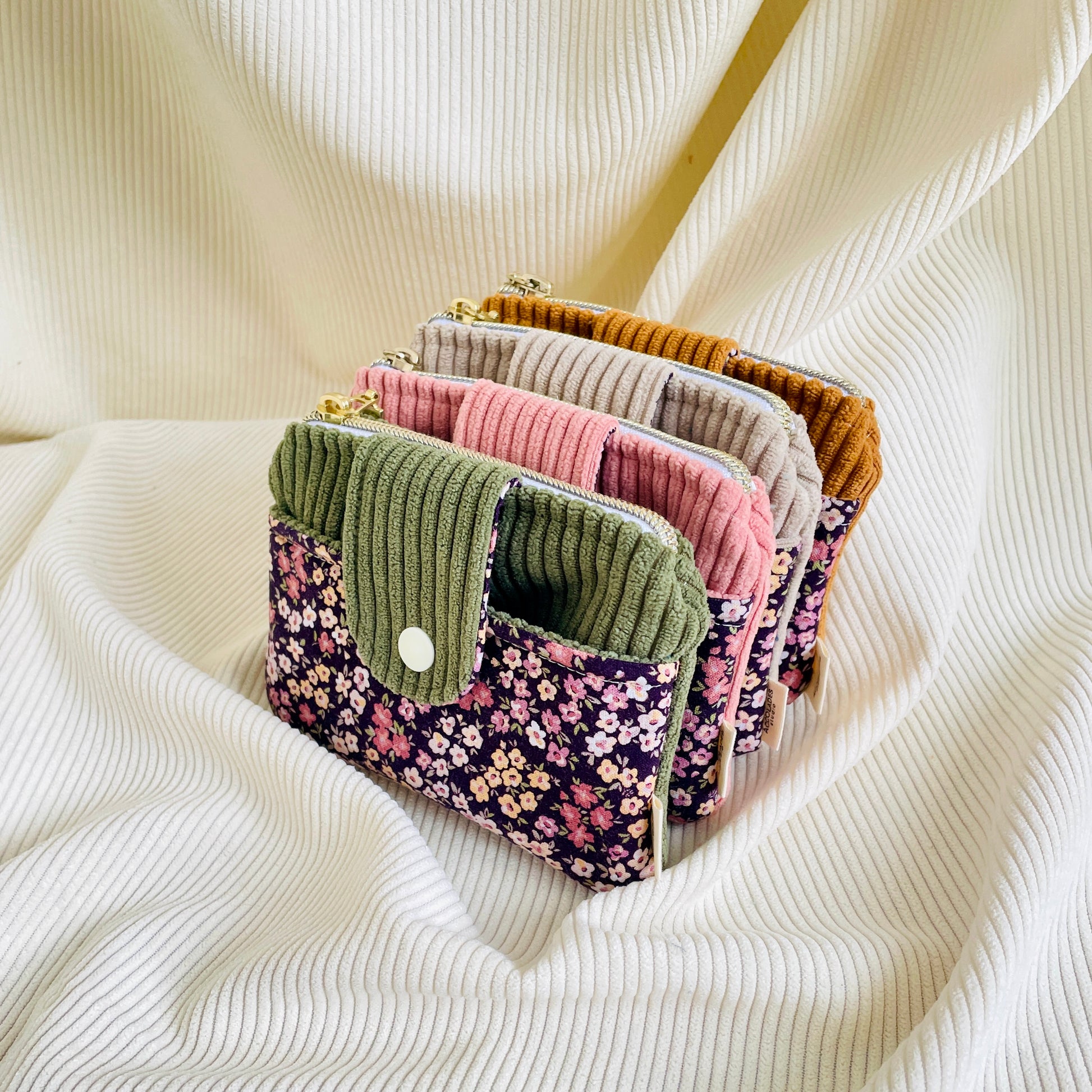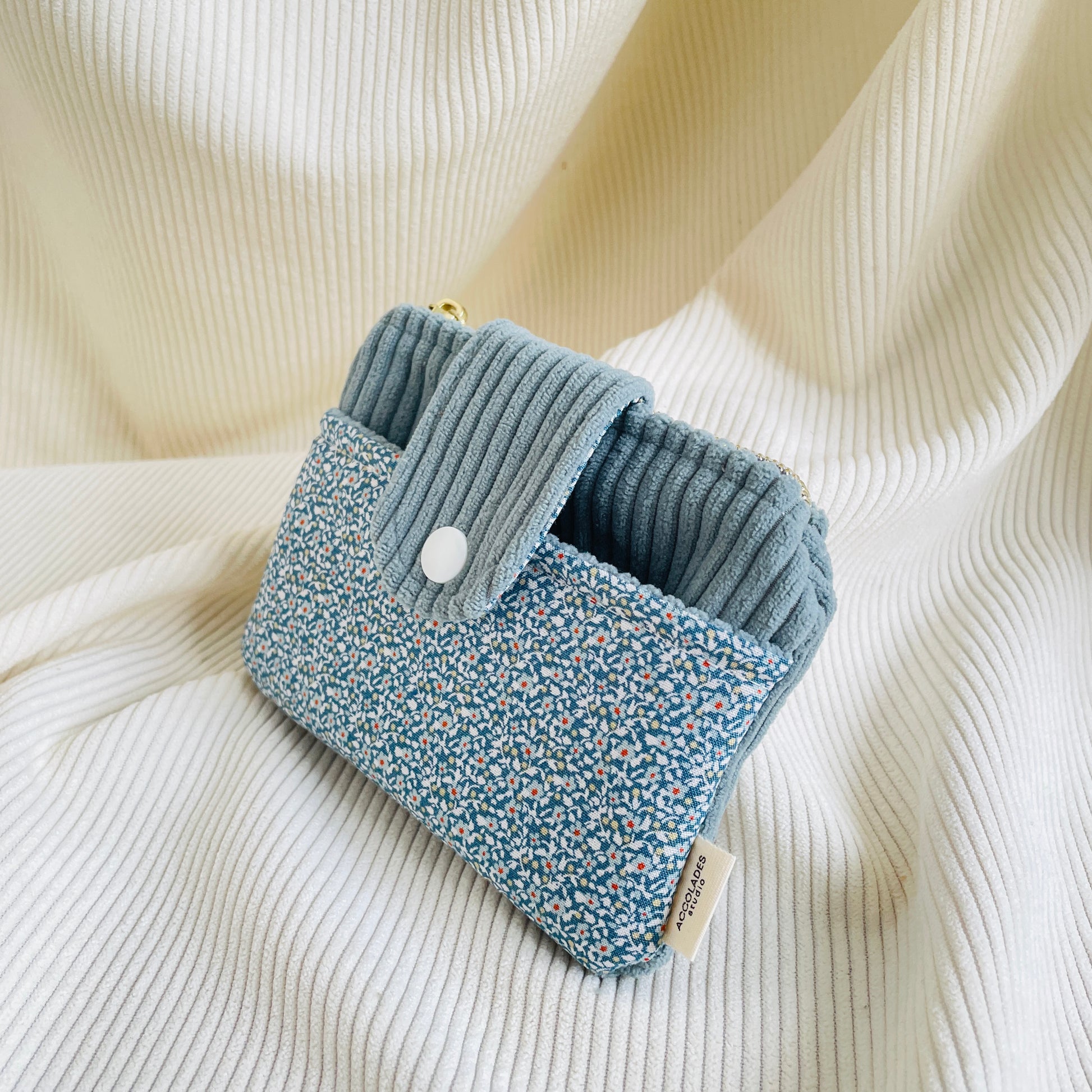 Porte-monnaie duo corduroy et coton fleuri. Comprend deux pochettes, dont une à rabat muni d’un bouton pression. Parfait pour ranger cartes et monnaie.