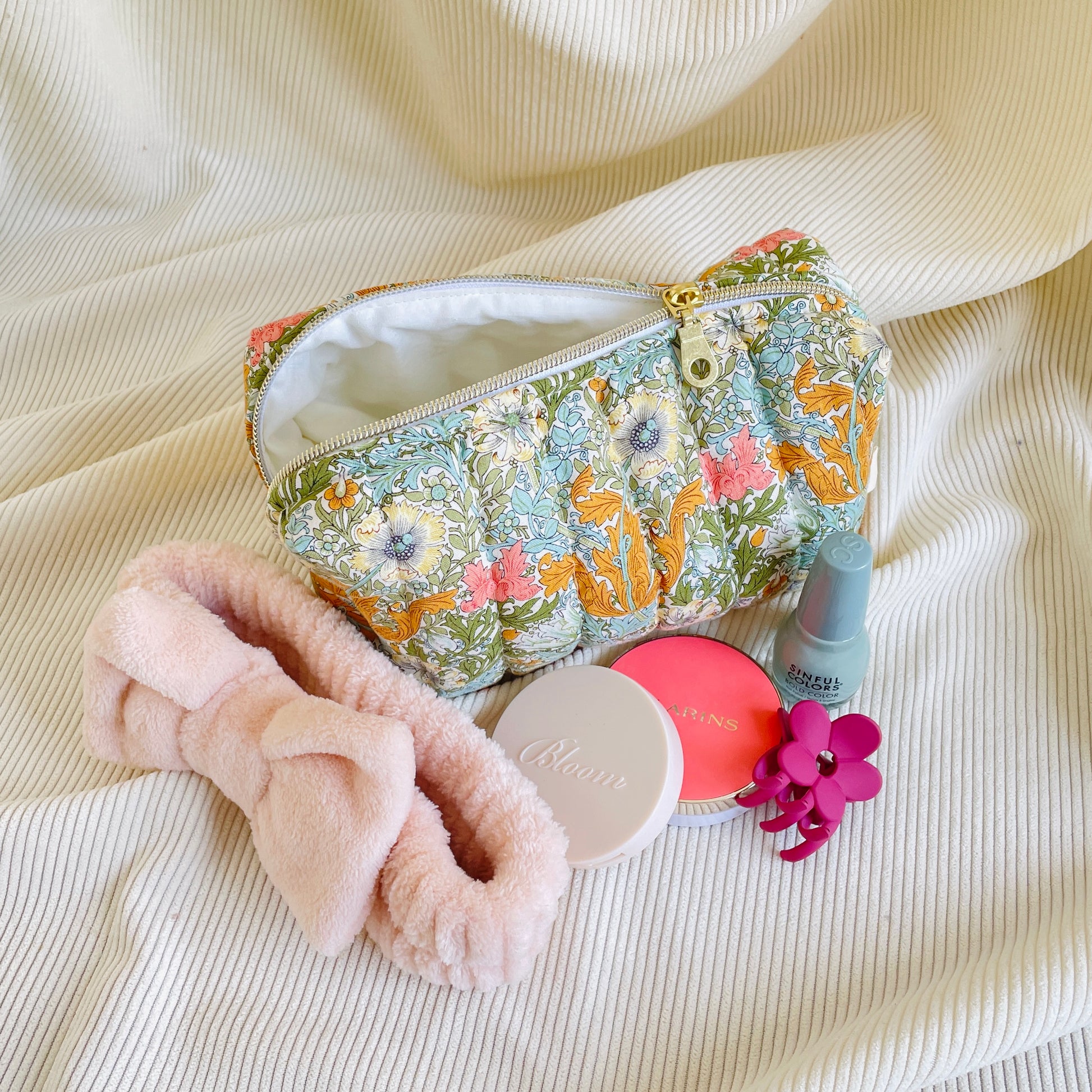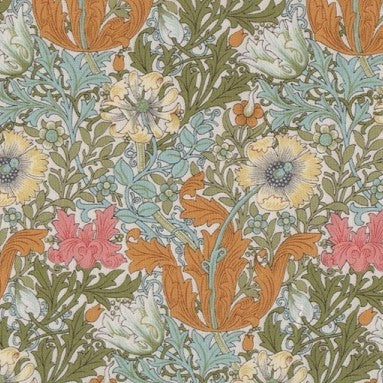 Trousse de toilette modèle Léa, confectionnée dans un coton imprimé William Morris. Doublure intérieure en coton uni de couleur crème. Fermeture à glissière en métal doré.